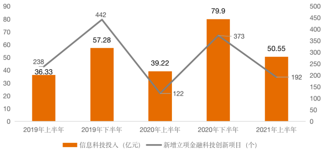 2、新增立項金融科技創新項目=報告期累計立項數量-上一年度/半年度累計項目數量,以2021年上半年為例,當期新增立項項目=2021年上半年累計立項數量-2020年末累計立項數量。