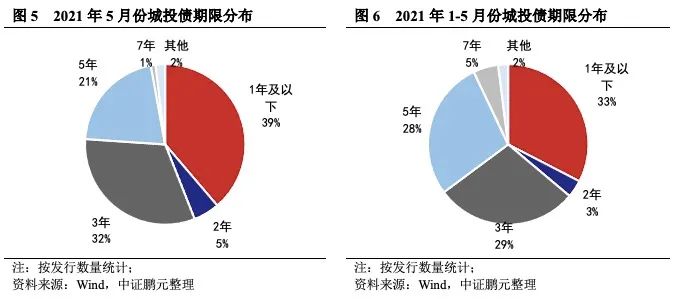 5月份城投債平均發(fā)行期限為2.78年,較4月份的3.64年縮短24%。發(fā)行期限縮短說明債券市場偏謹慎,風險偏好減弱。就發(fā)行數(shù)量來看,5月份發(fā)行的城投債中,3年期城投債發(fā)行67只,占比32%,發(fā)行規(guī)模462.04億元,占比31%;5年期城投債發(fā)行44只,占比21%,發(fā)行規(guī)模354.20億元,占比23%;一年以內(nèi)短期限期品種發(fā)行81只,發(fā)行規(guī)模580.20億元,占比分別為39%、38%。綜合1-5月情況來看,3年期、5年期和一年以內(nèi)城投債發(fā)行數(shù)量占比分別為29%、28%、33%,發(fā)行規(guī)模占比分別為27%、31%、31%。