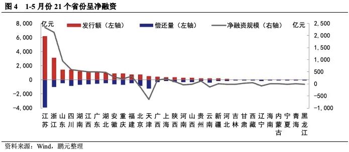 24個省份城投呈現(xiàn)凈償還,以江蘇、天津、北京的凈償還規(guī)模較大。5月份,城投債發(fā)行規(guī)模較為集中的省份與前期變化不大,江蘇、浙江、四川等省份繼續(xù)領(lǐng)跑全國。發(fā)行規(guī)模驟減導(dǎo)致5月份共有24個省份呈城投債凈償,江蘇、浙江和北京分別以凈償還255.65億元、194.50億元、187億元位于前三位;5月份,實現(xiàn)凈融資的省份僅4個,且凈融資規(guī)模均較小。