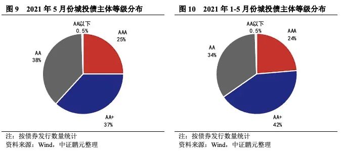 5月份高級別主體發(fā)債占比近6成,主體評級中樞下移。5月份,發(fā)行主體在AA+級及以上的城投債占比合計為61.8%,較上月減少1.5個百分點,主體信用級別中樞下移。綜合1-5月份情況來看,發(fā)行主體在AA+級(含)以上等級的城投債合計占比65%,較1-4月份中樞下移,但與2020年主體級別中樞基本持平。