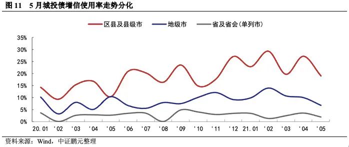 城投債增信使用率環(huán)比下降,高級別平臺融資環(huán)境相對較好。5月份,城投債總體增信使用率為11.0%,較4月份環(huán)比下降5.7個百分點。就不同行政級別的主體來看,5月份各個級別平臺的增信使用率不同程度的下降,以區(qū)縣級平臺的增信使用率較上月下降較大,由上月下降8.2個百分點至本月的18.95%。從當前數(shù)據(jù)可見,城投債一級市場的分化現(xiàn)象加重,高級別平臺融資環(huán)境相對更好。