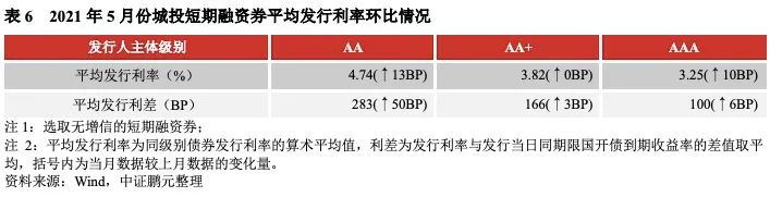 2021年5月份,無增信城投債的最高發(fā)行利率為7.50%,較上月下行50BP;最低發(fā)行利率為2.29%,較上月下行11BP,利率區(qū)間收窄。分級別來看,無增信AA級、AA+級、AAA級城投債的平均發(fā)行利率較4月份分別上行14BP,下行51BP、下行13BP,發(fā)行利差分別擴大24BP、收窄43BP、收窄7BP。城投短期融資券品種(含超短融)的發(fā)行利率全線上行,利差呈現(xiàn)擴大趨勢。