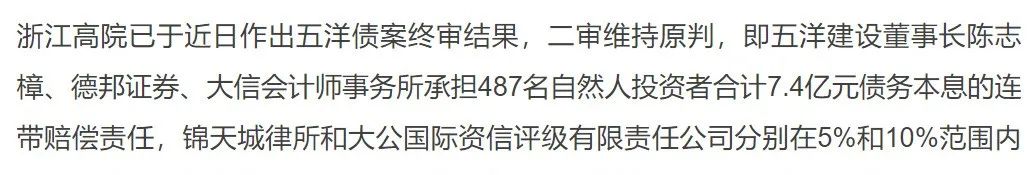 在此之前的2021年9月末,備受債券市場(chǎng)關(guān)注的五洋債二審判決已出結(jié)果,二審判決維持原判,德邦證券、大信會(huì)計(jì)師事務(wù)所、錦天城律師事務(wù)所和大公國(guó)際均需要承擔(dān)一定的賠償責(zé)任。目前提請(qǐng)上訴的是德邦證券,尚未看到會(huì)計(jì)師事務(wù)所、律師事務(wù)所和評(píng)級(jí)機(jī)構(gòu)的上訴信息。
