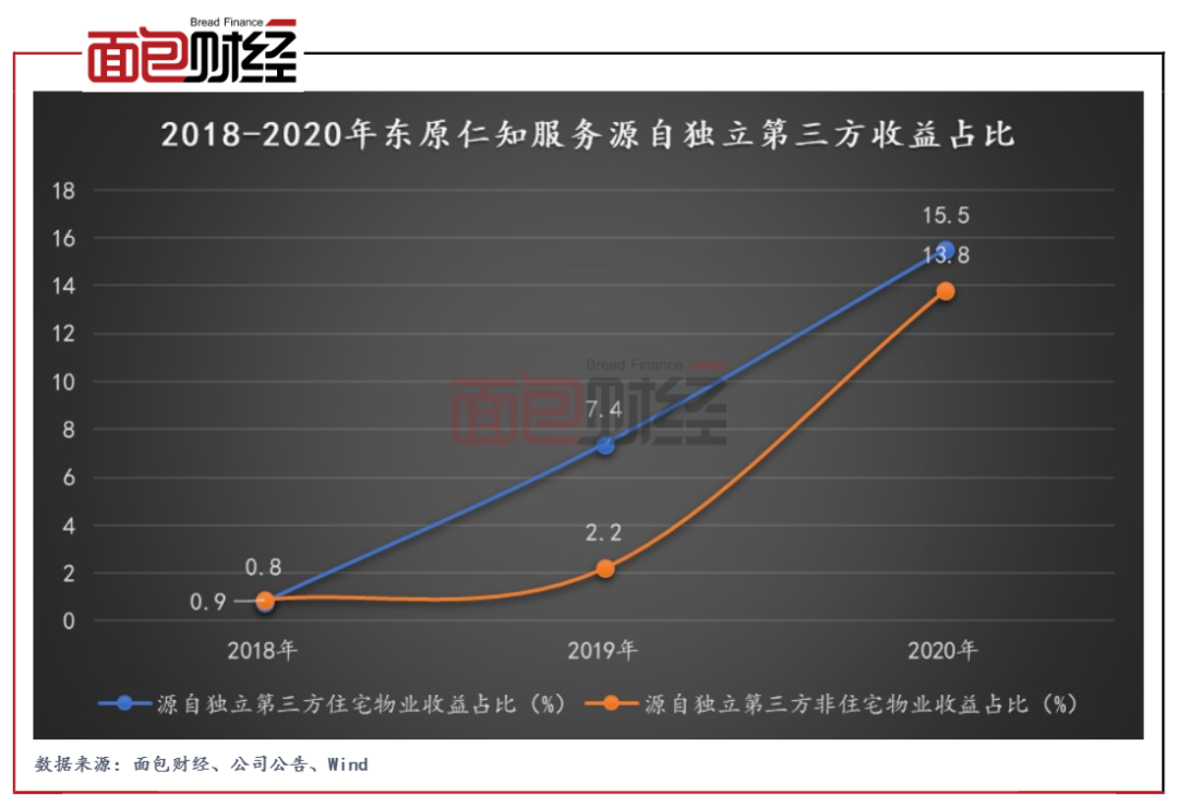 源自獨立第三方收益占比持續提升,對母公司依賴度降低。分業務來看:(1)住宅物業方面,東原仁知服務2020年源自獨立第三方的收益占比為15.5%,較2019年提升8.1個百分點,較2018年提升14.7個百分點。(2)非住宅物業方面,東原仁知服務2020年源自獨立第三方的收益占比為13.8%,較2019年提升11.6個百分點,較2018年提升12.9個百分點。
