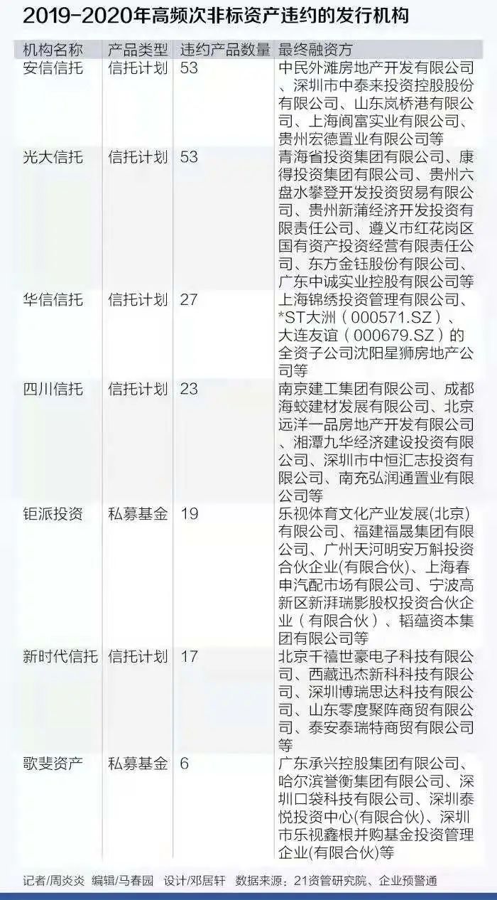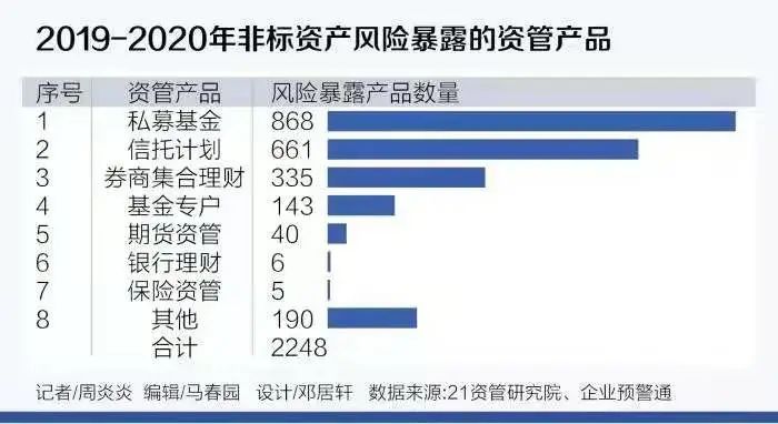 從21世紀(jì)資管研究院的數(shù)據(jù)顯示,2019-2020期間一共發(fā)生過(guò)的非標(biāo)違約債項(xiàng),僅從公開數(shù)據(jù)統(tǒng)計(jì)顯示就有超2200條之多。涉及信托計(jì)劃、券商集合、私募基金、期貨資管、銀行非保本理財(cái)和保險(xiǎn)資管,波及的資管機(jī)構(gòu)高達(dá)上百家。