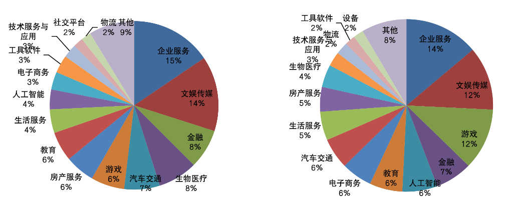 圖:七家互聯(lián)網(wǎng)巨頭2019年(左)和2020年(右)投資數(shù)量的行業(yè)分布