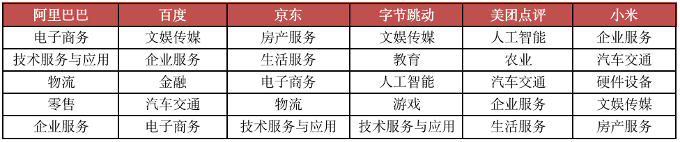 圖:其余6家互聯(lián)網(wǎng)巨頭2020年投資數(shù)量TOP5的行業(yè)列表