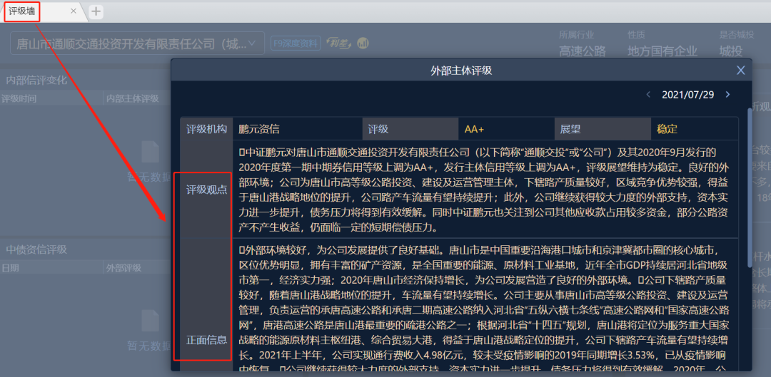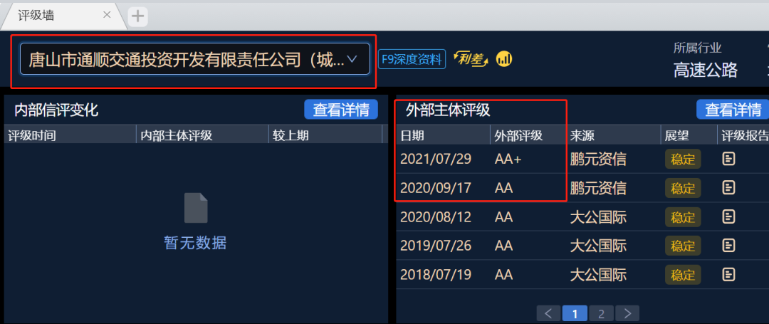 據(jù)DM終端-評級墻顯示“通順交投”2021年7月29日外部主體評級由AA調(diào)整為AA+,評級展望為穩(wěn)定。