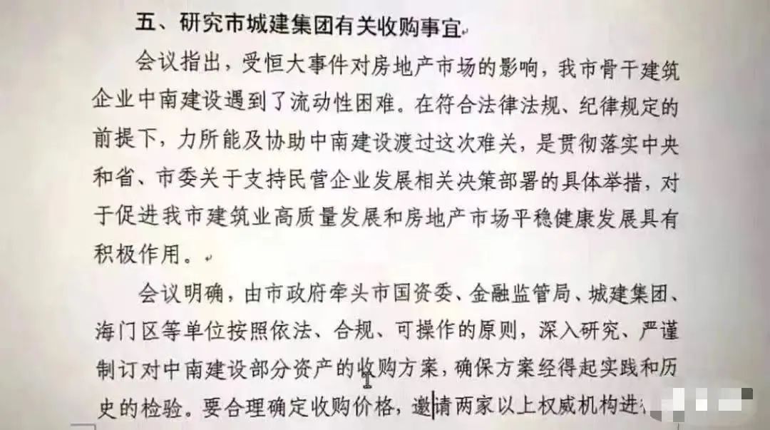 內容指出受到恒大事件影響,牽連中南建設處于流動性困難,力所能及協助中南度過難關。