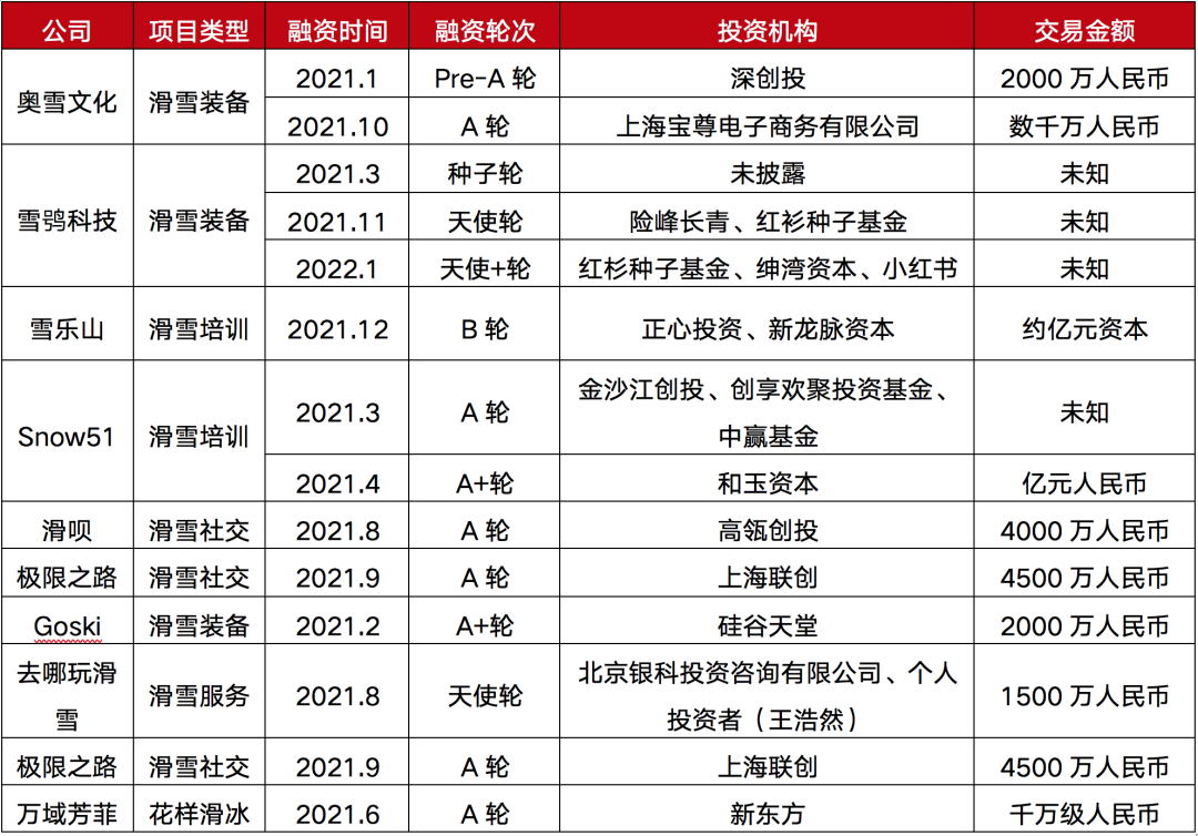 根據不完全統計,冰雪賽道歷年來發生投融資共計34.12億元,發生融資行為59起。融資賽道主要集中在冰雪產業中的滑雪品類,以專注于滑雪裝備、滑雪培訓和滑雪社交平臺的品牌為主要投資項目。在投融資層面,資本對雪經濟的追捧力度遠大于冰產業。