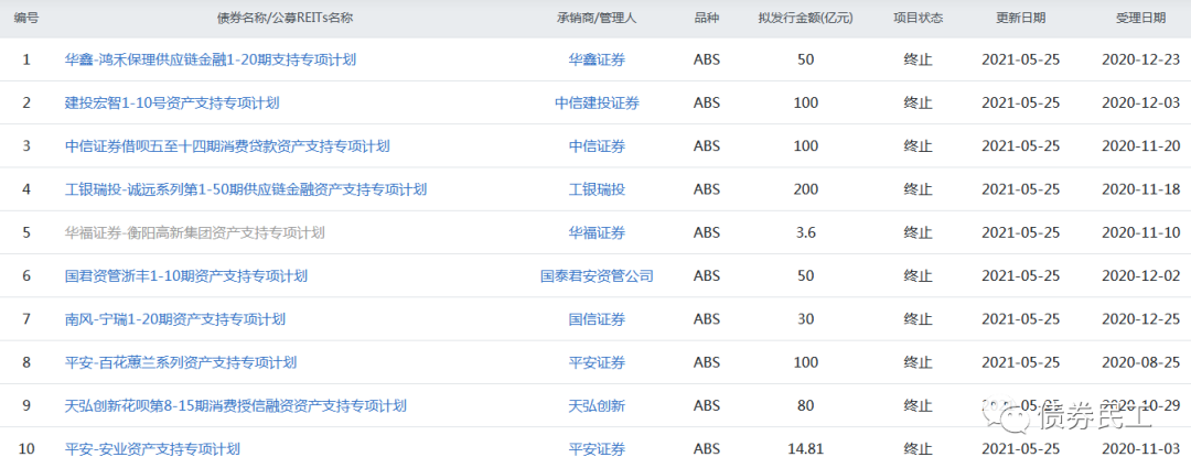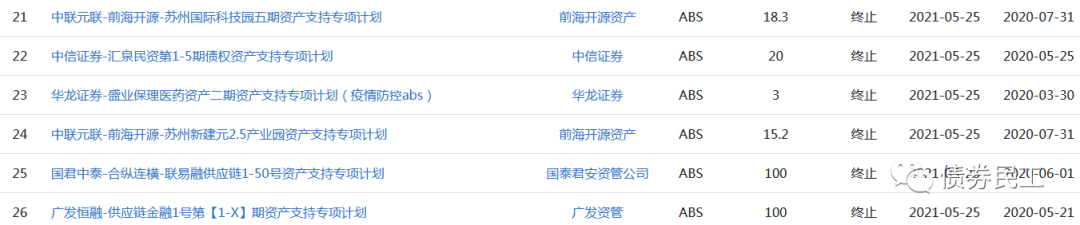 從本次終止的ABS的產品類型來看,包括供應鏈金融資產證券化產品、保理資產證券化產品、PPP項目資產證券化產品、疫情防控ABS等各種類型的資產證券化產品。