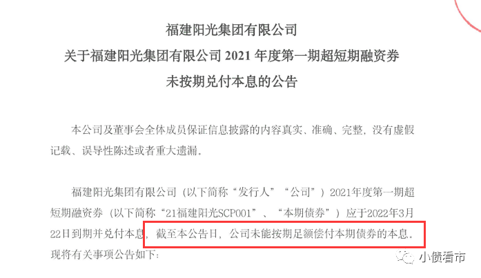 3月22日,福建陽光集團有限公司(以下簡稱“陽光集團”)公告稱,“21福建陽光SCP001”于2022年3月22日應兌付本金5億元、利息2404萬元,因公司流動性出現階段性緊張,未能支付本期債券本息。
