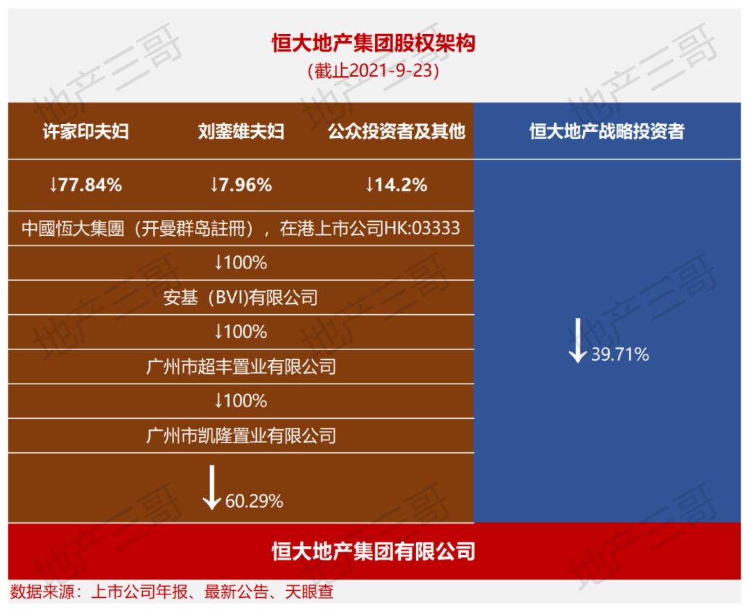 目前,上市公司中國恒大(HK:03333)對恒大地產集團持股比例為60.29%,其中:許家印夫婦對恒大地產集團的持股比例為46.93%;戰略投資者對恒大地產集團的持股比例為:39.71%。