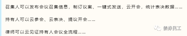 更為關鍵的是,債券持有人、發行人、律師、受托管理人、信用增進機構和信用評級機構等均可以通過持有人會議管理系統參會,實現了債券各利益相關方的全面參會,能夠更好地保障各方的利益。