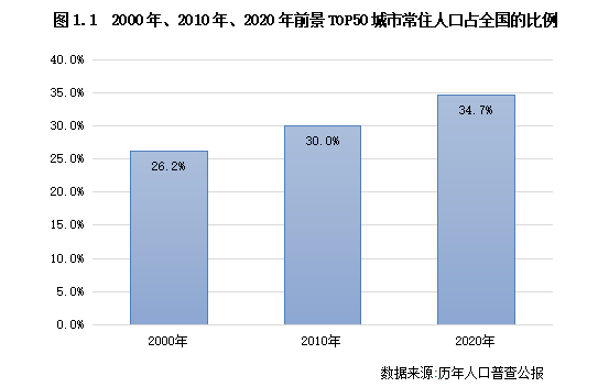 1、集中度:前景TOP50城市人口占比達35%,人口聚集度加速提升