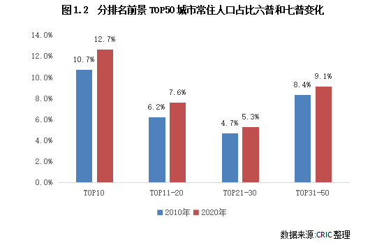 值得關注的是,頭部城市對人口的聚集度正在加速提升。這些城市均是區(qū)域發(fā)展中心城市,除北上廣深等傳統(tǒng)一線城市外,杭州、成都、重慶、武漢、南京和寧波等新興一線城市也因活躍的經(jīng)濟發(fā)展下吸引了大量的流動人口。對比六普和七普數(shù)據(jù)來看,TOP10城市的常住人口占比由2010年的10.7%上漲至2020年的12.7%,提升了2.7個百分點,明顯高于TOP10之后的城市。
