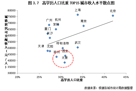 3.2西安、太原高學歷人才比例遠超廣州,但經(jīng)濟發(fā)展?jié)摿τ写M一步發(fā)掘