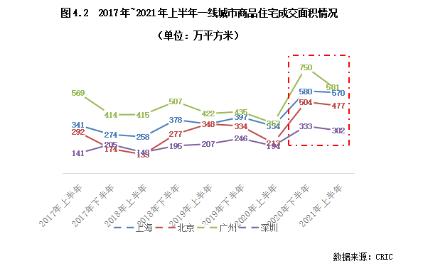 正是由于外來人口的持續(xù)流入,一線城市的購房需求支撐長期表現(xiàn)強勁,尤其是在2020年上半年疫情發(fā)生之后, 一線城市的樓市表現(xiàn)超出預期,韌性十足。具體來看,雖然在2020年上半年疫情的影響下四城的住宅成交量同比下滑,但2020年下半年樓市成交迅速反彈,北上廣深四個城市的商品住宅成交量均明顯走高,并達到2017年以來的最高點,其中上海、廣州和深圳的同比漲幅均在15%以上。進入2021年,四城的樓市成交熱度仍保持在高位;雖然上海、深圳、廣州等城市收緊了調(diào)控,但四城市2021年上半年的商品住宅成交規(guī)模較以往同期仍是上漲的,和2020年下半年相比也僅是小幅下跌。不僅成交量上行,一線城市的成交均價同樣也呈現(xiàn)出持續(xù)上揚的態(tài)勢;由此可見,一線城市的樓市韌性之足。