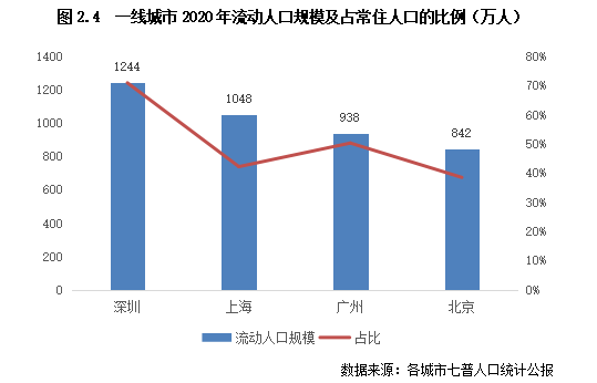 具體到各城市來看。在流動人口規(guī)模方面,一線城市規(guī)模優(yōu)勢遙遙領先,四個城市的流動人口規(guī)模均在800萬以上,其中深圳和上海更是超過了1000萬,位居典型城市TOP1、2位。在比例方面,“移民城市”深圳以71%的占比位居四個城市首位,是一線城市中唯一流動人口規(guī)模顯著高于本地戶籍人口的城市。