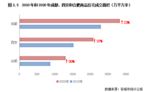 二線城市中,成都、重慶、合肥等中西部城市在“強省會”戰(zhàn)略支持下經(jīng)濟發(fā)展邁入快速通道,城市吸引力也顯著提升,流動人口規(guī)模較十年前均顯著增加,如成都、合肥和西安2020年的流動人口規(guī)模較十年前均增長了一倍以上,增量都在200萬以上。在此影響下,當?shù)刈≌山灰?guī)模也快速增長,至2020年這三個城市的商品住宅成交面積均超過了1000萬平方米,較十年前漲幅均在20%以上。