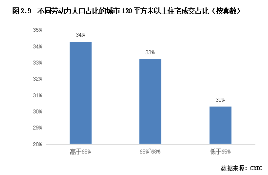 結合年齡結構來看,雖然不同城市之間基本面差異較大,但勞動力占比越高的城市,中大面積段的產(chǎn)品市場份額也相對更高,如勞動力占比高于68%的城市,120平方米以上的產(chǎn)品成交份額平均約34%,比勞動力占比低于65%的城市平均高出了4個百分點。