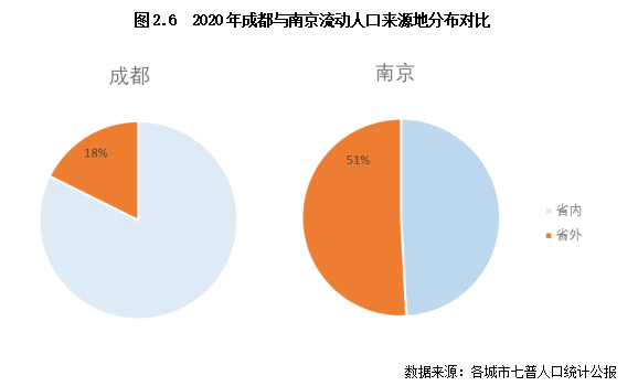 不過,相對于南京、廈門等東部沿海城市,成都、西安等城市對省內(nèi)人口的吸引力較強,對省外人口的吸引力相對偏弱。如在成都的流動人口構成中,82%來自四川省省內(nèi),省外流動人口的占比不足兩成,而南京流動人口中則有一半以上來自省外,比例明顯高于成都。由此來看,成都等城市對外省人才的吸引力有待進一步提升。