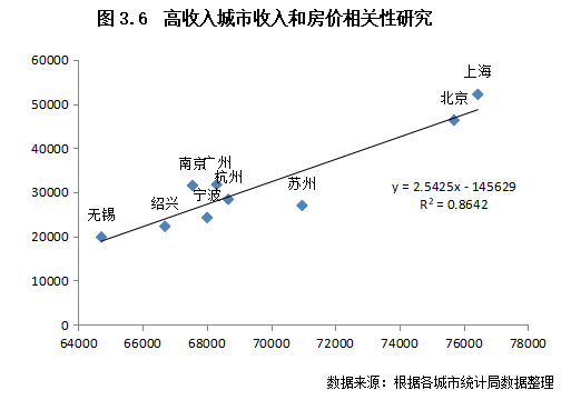 值得注意的是,高收入城市通常也是房價較高的城市,我們將TOP10城市收入和房價進行線性擬合,結果發(fā)現(xiàn),排除深圳一個異常項之后,R2高達0.86,相關性高達0.93。這表明高收入群體對高房價有較強的支撐性,這也與印證了前文提到的收入水平較為突出的京、滬房價同樣遙遙領先。