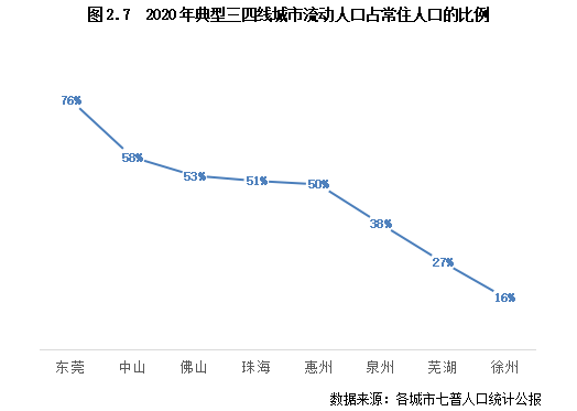 三四線城市方面,上文中提到的人口結構最為年輕的大灣區(qū)城市,如東莞、佛山等,流動人口規(guī)模也顯著高于其他三四線城市。同時,這些城市的流動人口占常住人口的比重均超五成以上,尤其是東莞,流動人口占比已高達76%。因此,這些城市中外來人口的購房需求已成為當?shù)刭彿恐髁Α?/p>