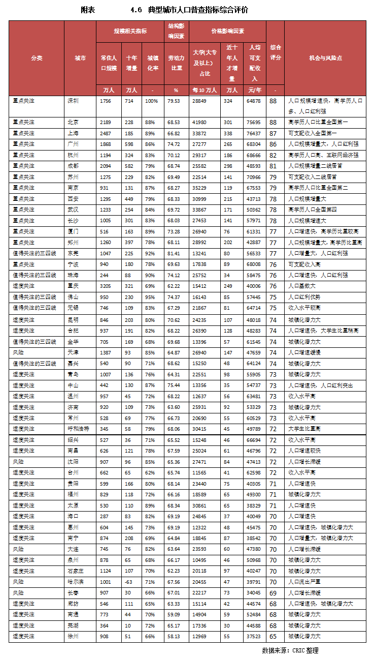 為了對TOP50城市房地產(chǎn)市場前景有一個相對客觀、綜合的評價,基于上文的研究,我們從規(guī)模、結構和房價三個維度選取了常住人口規(guī)模、近十年人口增量、城鎮(zhèn)化率、勞動力比重、高學歷人口比重、高學歷人口增量和收入水平等七個指標,并賦予各影響因子適當?shù)臋嘀兀瑥娜丝诮嵌葮嫿艘粋€相對客觀的綜合評價體系,將50個樣本城市分為重點關注的城市、適度關注城市、風險城市以及表現(xiàn)突出的三四線城市。(詳見文末附表)