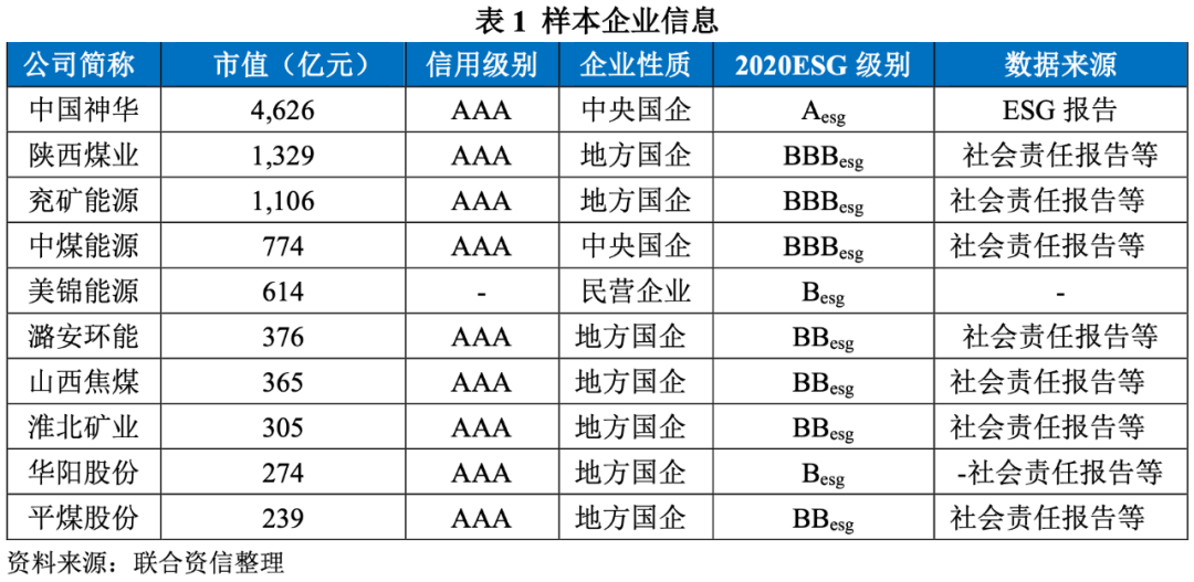 本文選擇2022年2月9日A股上市公司中Wind行業為煤炭的市值排名前10名的公司,分別為中國神華、陜西煤業、兗礦能源、中煤能源、美錦能源、潞安環能、山西焦煤、淮北礦業、華陽股份、平煤股份。ESG指標數據摘自各家公司披露的ESG報告或社會責任報告,選擇2018年-2020年三年年的數據。總體來看,煤炭行業ESG評級中樞較低。其中,中國神華披露了ESG報告,陜西煤業等7家企業披露了社會責任報告,美錦能源和華陽股份未披露社會責任報告。中國神華ESG評分最高,除了指標表現較好以外,信息披露領先也獲得加分。
