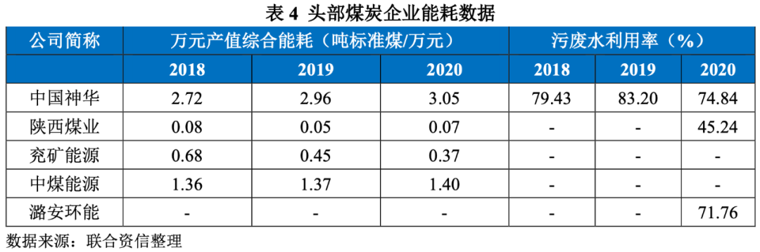 資源消耗主要包含綜合能源消耗和水資源用量,考慮總量和循環利用情況,但是具體到企業其計算方法和數據披露口徑有所差別。《綜合能耗計算通則》(GB/T2589-2008)公布了綜合能耗的能源范圍與計算方法,一次能源包括原煤、原油、天然氣、水力、風力、太陽能、生物質能等。聯合ESG選擇萬元產值綜合能耗這一指標,以噸標準煤的耗能口徑除以營業收入。從下表來看,中國神華萬元產值綜合能耗整體較高,陜西煤業較低,這里可能存在計算口徑不一致的情況。對于口徑不一致的問題,聯合資信對具體能源消數據進行評估,并結合產能數據進行綜合判斷。