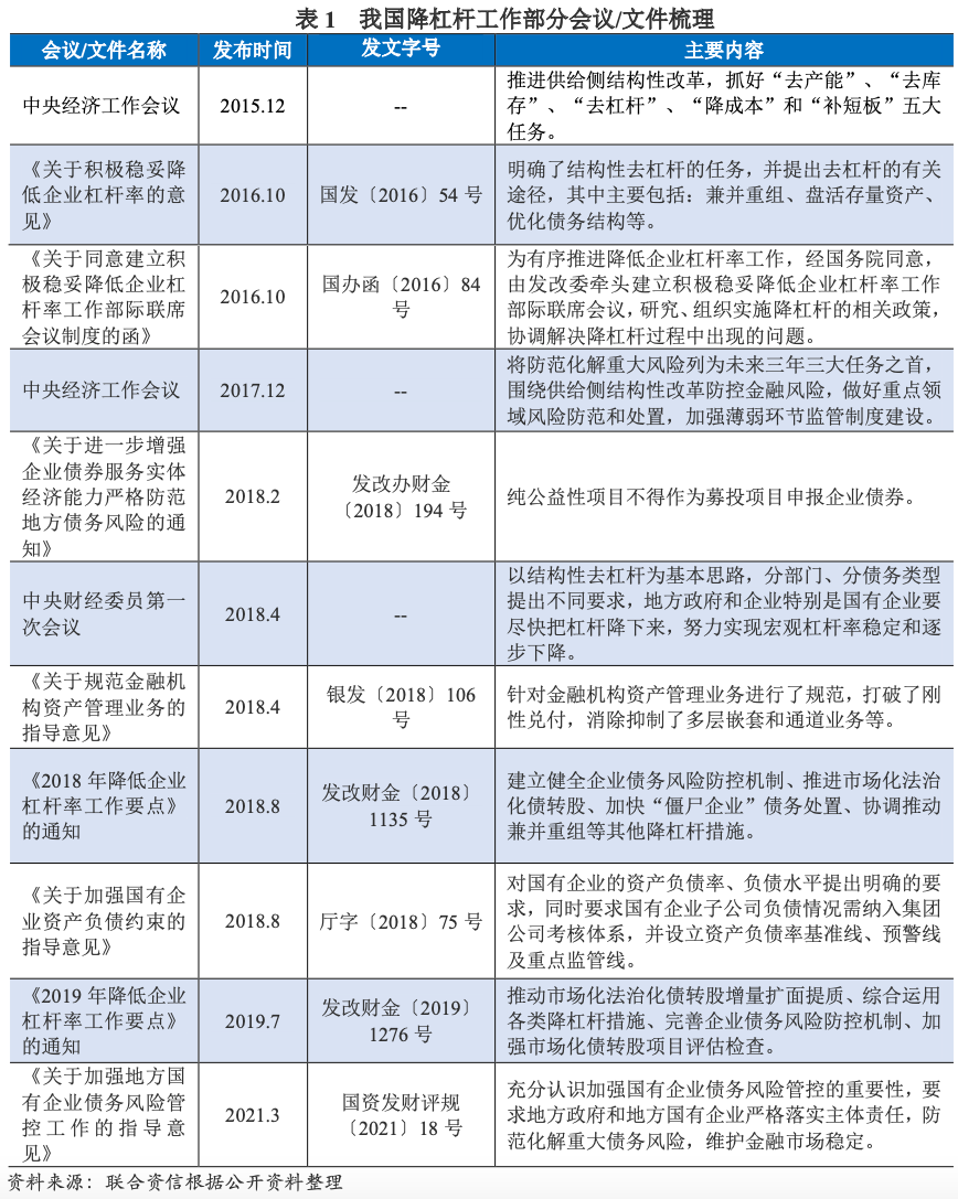 2015年12月,中央經(jīng)濟(jì)工作會議將結(jié)構(gòu)性改革作為經(jīng)濟(jì)社會發(fā)展的首要目標(biāo),提出“去產(chǎn)能”、“去庫存”、“去杠桿”、“降成本”和“補短板”五大任務(wù);2016年10月,中華人民共和國國務(wù)院(以下簡稱“國務(wù)院”)發(fā)布《國務(wù)院關(guān)于積極穩(wěn)妥降低企業(yè)杠桿率的意見》的去杠桿綱領(lǐng)性文件;2017年,中國共產(chǎn)黨第十九次全國代表大會后,防范風(fēng)險正式成為了我國經(jīng)濟(jì)工作的主要基調(diào),降杠桿則是供給側(cè)結(jié)構(gòu)性改革中的主要任務(wù)之一。2018年,我國政府及相關(guān)部門陸續(xù)印發(fā)相應(yīng)文件,降杠桿相關(guān)政策環(huán)境持續(xù)趨嚴(yán)。2021年3月,中華人民共和國國務(wù)院國有資產(chǎn)監(jiān)督管理委員會(以下簡稱“國資委”)印發(fā)《關(guān)于加強地方國有企業(yè)債務(wù)風(fēng)險管控工作的指導(dǎo)意見》(國資發(fā)財評規(guī)〔2021〕18號),指出要充分認(rèn)識加強國有企業(yè)債務(wù)風(fēng)險管控的重要性,監(jiān)管企業(yè)債務(wù)及風(fēng)險管控工作仍未松動。