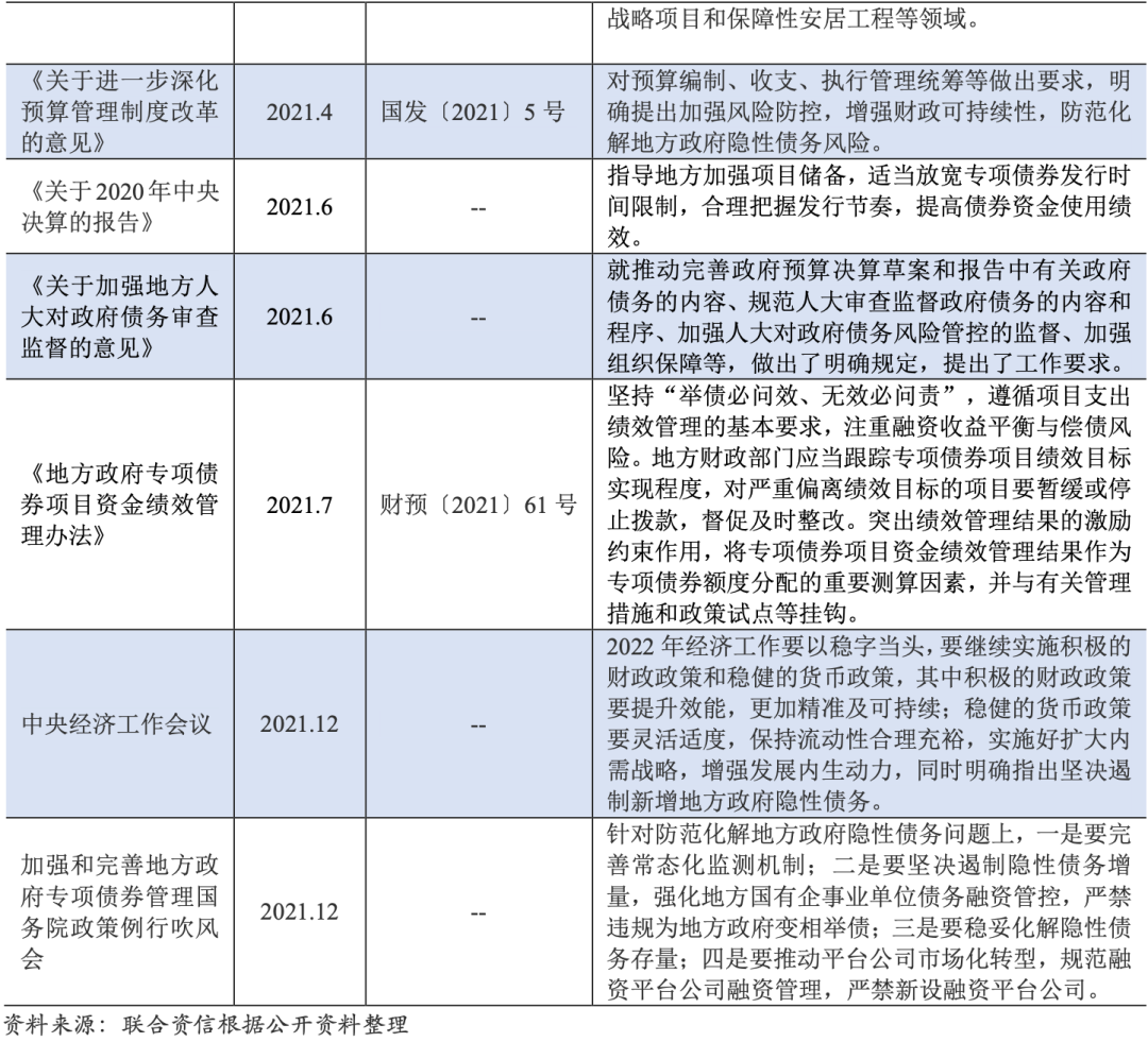 2008年全球金融危機(jī)爆發(fā),我國政府為進(jìn)一步擴(kuò)大內(nèi)需、促進(jìn)經(jīng)濟(jì)平穩(wěn)較快增長,安排了總規(guī)模達(dá)4萬億元的中央投資資金,投向主要為保障性住房、棚戶區(qū)改造、鐵路、公路、機(jī)場、水利、醫(yī)療衛(wèi)生、教育等基礎(chǔ)設(shè)施建設(shè)。基礎(chǔ)設(shè)施建設(shè)投資作為我國拉動內(nèi)需穩(wěn)定經(jīng)濟(jì)的重要途徑,城投企業(yè)在這當(dāng)中起到了重要作用,但大規(guī)模的投資計劃也使得城投企業(yè)所負(fù)擔(dān)的債務(wù)快速上升。2014-2018年間,我國針對地方政府和城投企業(yè)的相關(guān)政策監(jiān)管均較為嚴(yán)格,在防范化解地方政府債務(wù)風(fēng)險的同時也逐步規(guī)范了地方政府及地方國有企業(yè)的投融資行為。2019年,宏觀經(jīng)濟(jì)下行壓力加大,滬深交易所窗口指導(dǎo)放松了對城投公司的發(fā)債限制;2020年,新冠肺炎疫情全球化流行,我國在防范風(fēng)險的同時也推行了適當(dāng)?shù)臄U(kuò)張政策拉動內(nèi)需,穩(wěn)定經(jīng)濟(jì)增長,各項結(jié)構(gòu)性寬松的政策直接或間接地為城投企業(yè)提供了較好的再融資環(huán)境。2021年,各項政策對地方政府隱性債務(wù)的管控及債券資金的使用效率提出了新的要求,償債風(fēng)險及地方政府隱性債務(wù)風(fēng)險的防范化解工作持續(xù)實施。