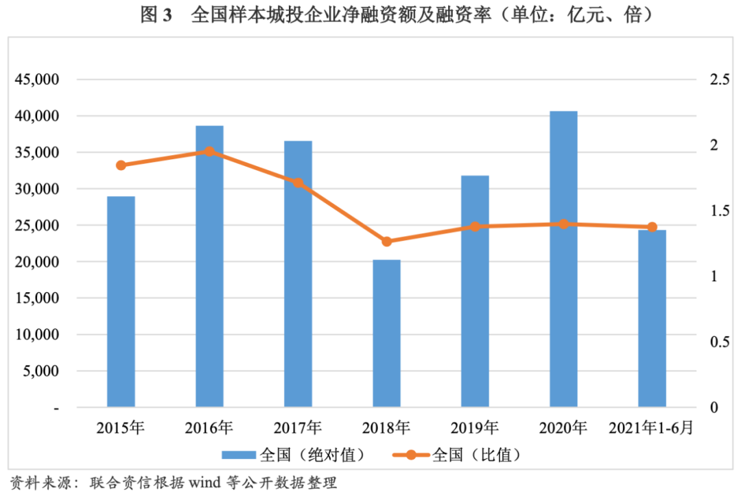 受到“三去一降一補”、結(jié)構(gòu)性去杠桿等政策的影響,2017年無論是以絕對值形式還是比值形式表現(xiàn)的凈融資情況均較2016年有所下降。2018年,中國人民銀行和中國銀行保險監(jiān)督管理委員會聯(lián)合印發(fā)《關(guān)于規(guī)范金融機(jī)構(gòu)資產(chǎn)管理業(yè)務(wù)的指導(dǎo)意見》,要求規(guī)范非標(biāo)債務(wù)的運行、限制債務(wù)規(guī)模的快速擴(kuò)張,在各項針對地方政府和城投企業(yè)債務(wù)管理的監(jiān)管政策加碼下,樣本城投企業(yè)凈融資額(絕對值)與融資率(比值)均降至2015年以來最低點,融資難度明顯上升。2019年我國宏觀經(jīng)濟(jì)下行壓力上升,政府逆周期調(diào)節(jié)力度加大,城投企業(yè)緊張的融資環(huán)境有所緩解,凈融資的兩個指標(biāo)均較2018年有所上升。2020年,受新冠肺炎疫情影響,基礎(chǔ)設(shè)施建設(shè)投資再次成為經(jīng)濟(jì)增長的新動力,城投企業(yè)融資環(huán)境進(jìn)一步改善,凈融資額(絕對值)達(dá)2015年以來最高點,融資率(比值)較2019年略有增加。2021年1-6月,樣本城投企業(yè)融資率(比值)較2020年略有下降。整體看,融資率(比值)因剔除了企業(yè)規(guī)模的影響,變動趨勢較凈融資額(絕對值)相比更為平緩。
