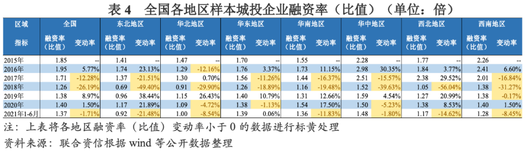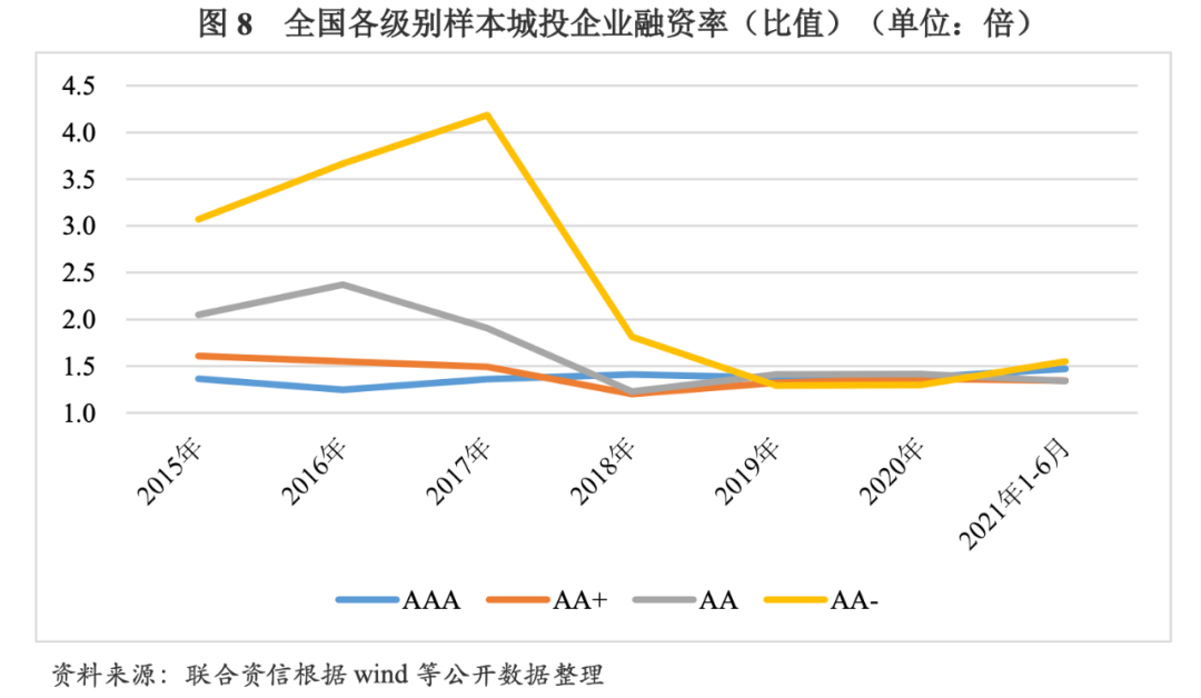 剔除企業(yè)規(guī)模對凈融資額的影響,以融資率(比值)的表現(xiàn)形式來分析不同級別樣本城投企業(yè)的融資情況。不同級別樣本城投企業(yè)對于政策變化的反應(yīng)程度有所不同,樣本城投企業(yè)級別越高,受降杠桿政策及環(huán)境的影響越小。其中,AAA樣本城投企業(yè)融資率(比值)在1.0~1.5倍范圍內(nèi)波動,表現(xiàn)更為平穩(wěn)。AA+樣本城投企業(yè)融資率(比值)下降幅度遠(yuǎn)低于AA及AA-樣本城投企業(yè),2015-2018年逐年下降,2018年為1.20倍,年均降幅為9.24%;2019年至2021年上半年波動增長,2021年上半年為1.34倍。AA樣本城投企業(yè)融資率(比值)從2016年開始下降,2018年降至1.23倍,2019年及2020年略有增長,2021年1-6月下降至1.34倍。AA-樣本城投企業(yè)以2017年為變化拐點,融資率(比值)由升轉(zhuǎn)降,從2017年的4.19倍銳減至2019年的1.29倍,年均降幅高達(dá)44.44%;2020年及2021年1-6月較2019年有所增長。