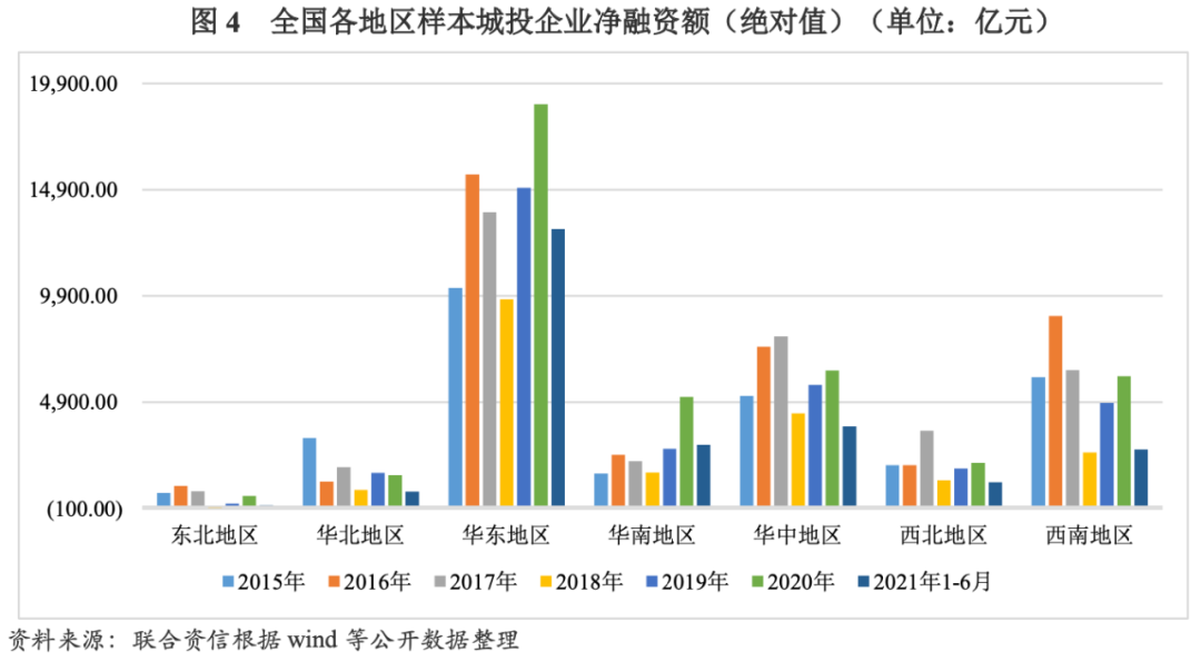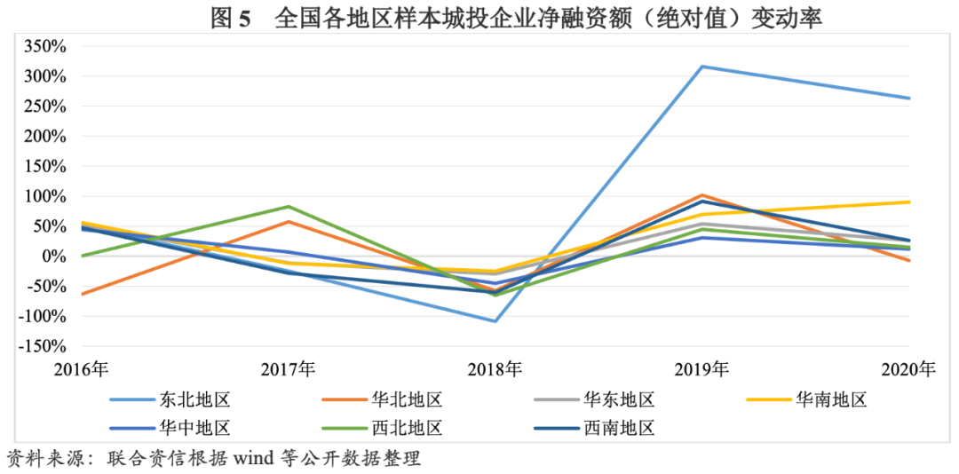 從區(qū)域分布來看,2015-2020年,華東、華南、西南地區(qū)樣本城投企業(yè)凈融資額(絕對值)變動趨勢與全國樣本城投企業(yè)變動趨勢大體一致。2016年降杠桿等綱領(lǐng)性文件印發(fā)后,上述三個地區(qū)紛紛響應(yīng),2017年凈融資額(絕對值)均較2016年有所減少,2018年受監(jiān)管政策持續(xù)收緊的影響,凈融資額(絕對值)分別降至2015年以來最低點;此后兩年,我國加大逆周期調(diào)節(jié)力度,城投企業(yè)融資環(huán)境向好,華東、華南、西南地區(qū)樣本城投企業(yè)凈融資額(絕對值)保持增長。