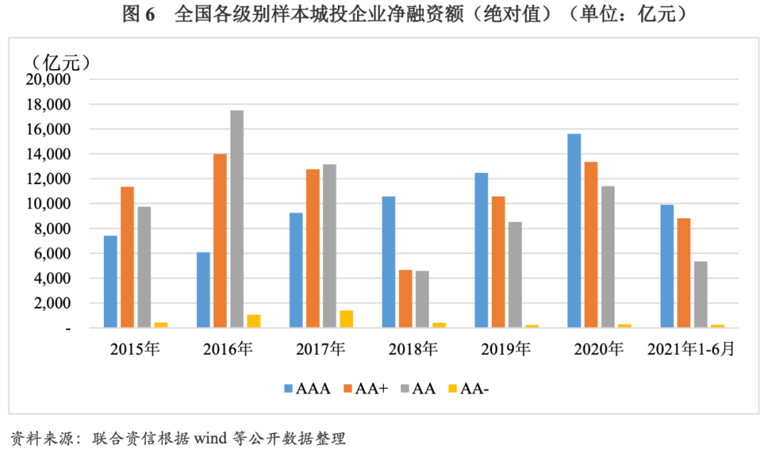 2015-2020年,主體信用級別為AAA的樣本城投企業(yè)因自身信用水平高,融資環(huán)境相對寬松,除2016年凈融資額(絕對值)同比略有下降外,其余年份均持續(xù)上升,2020年為15610.20億元,遠(yuǎn)高于其他級別樣本城投企業(yè)。2016-2018年,受到降杠桿等政策的影響,主體信用級別為AA+及AA的樣本城投企業(yè)凈融資額(絕對值)呈逐年下降趨勢,2018年分別降至4646.21億元和4586.48億元,為2015年以來最低值;此后兩年凈融資額(絕對值)持續(xù)增長,2020年分別上升至13342.87億元和11403.22億元。主體信用級別為AA-的樣本城投企業(yè)因信用水平相對較低,凈融資額(絕對值)遠(yuǎn)低于其他級別,2017年為趨勢變化的拐點,在降杠桿政策的大背景下,凈融資額(絕對值)由增轉(zhuǎn)降,2020年下降至297.91億元。2021年1-6月,樣本城投企業(yè)按自身信用級別由高到低排序,對應(yīng)凈融資額(絕對值)依次下降。