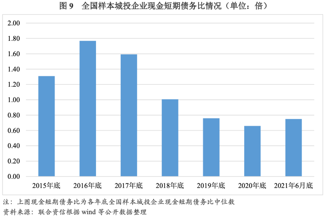 2015-2016年,全國信用政策較為寬松,2015年底和2016年底樣本城投企業(yè)現(xiàn)金短期債務(wù)比分別為1.31倍和1.77倍,整體流動性水平尚可。2017-2020年,在降杠桿背景下,樣本城投企業(yè)現(xiàn)金短期債務(wù)比呈逐年下降趨勢,由2017年底的1.59倍降至2020年底的0.66倍,城投企業(yè)流動性持續(xù)趨緊。其中,在監(jiān)管政策大幅收緊的2018年,樣本城投企業(yè)流動性壓力顯著增加。2021年6月底,樣本城投企業(yè)現(xiàn)金短期債務(wù)比較2020年底有所上升,但仍存在一定流動性壓力。