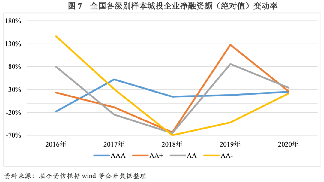 2017年,西北地區(qū)因烏魯木齊市、西安市等地城投企業(yè)基礎(chǔ)設(shè)施建設(shè)的融資需求較大,華中地區(qū)因軌道交通行業(yè)發(fā)展建設(shè)的需要,凈融資額(絕對值)較2016年有所增長;2018年,凈融資額(絕對值)較2017年開始大幅下降,西北地區(qū)降幅為65.26%、華中地區(qū)降幅為45.33%;2019年受到寬松政策的利好,上述地區(qū)凈融資額(絕對值)開始回升;2020年,西北、華中地區(qū)凈融資額(絕對值)均大幅增加。