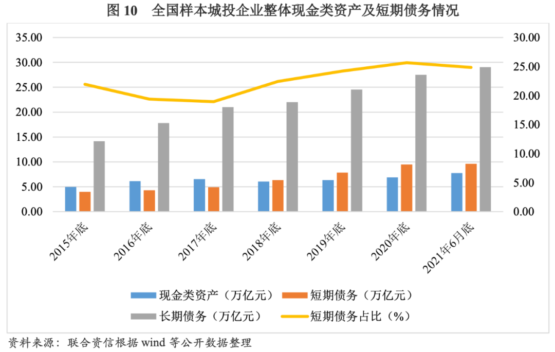 2015-2020年,樣本城投企業(yè)整體現(xiàn)金類資產(chǎn)由2015年底的4.96萬億元增至2020年底的6.88萬億元,年均復(fù)合增長8.50%,增長較為平穩(wěn);短期債務(wù)由2015年底的3.98萬億元增至2020年底的9.50萬億元,年均復(fù)合增長24.29%,增速較快,主要原因為城投企業(yè)陸續(xù)進(jìn)入償債高峰期,從而導(dǎo)致城投企業(yè)短期償債壓力不斷攀升。從樣本城投企業(yè)整體債務(wù)結(jié)構(gòu)看,2015-2020年,樣本城投企業(yè)短期債務(wù)占比以2017年為拐點呈持續(xù)上升態(tài)勢,由2017年底的18.95%升至2020年底的25.65%,側(cè)面反映出城投企業(yè)新融資獲得的資金期限有所縮短,在宏觀審慎和降杠桿的大背景下,各類金融機(jī)構(gòu)及債券投資者對城投企業(yè)整體持觀望態(tài)度,對給予城投企業(yè)長期限資金支持的態(tài)度更加謹(jǐn)慎。