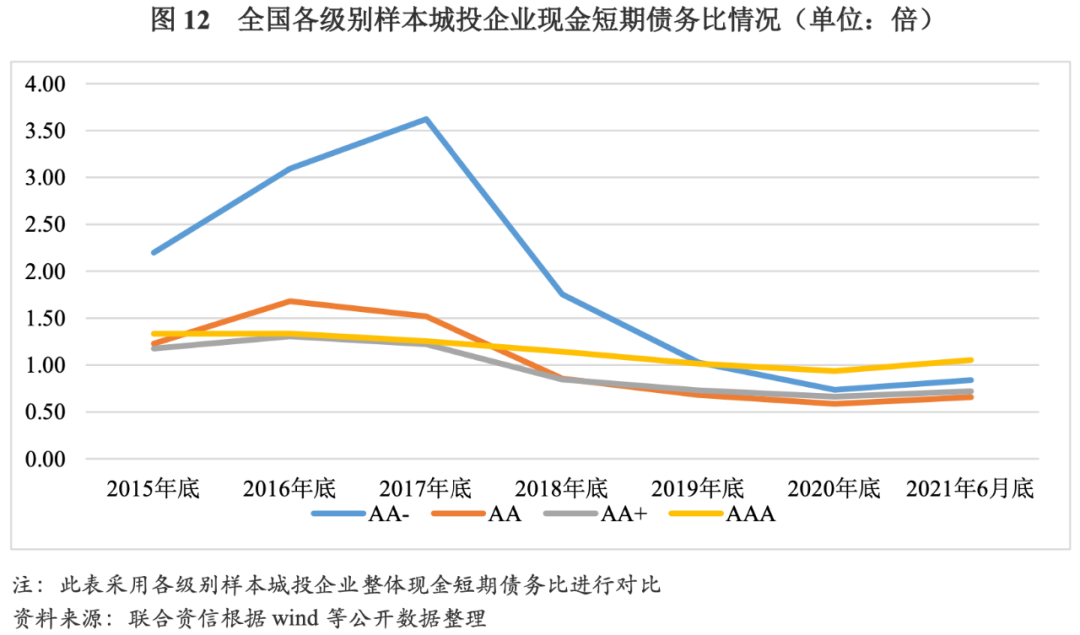 從級別分布來看,2015-2016年,不同主體信用級別的樣本城投企業(yè)現(xiàn)金短期債務(wù)比均不同程度上升。2017-2020年,AA-樣本城投企業(yè)現(xiàn)金短期債務(wù)比由2017年底的3.62倍下降至2020年底的0.74倍,降幅最大,主要系自2018年起融資渠道持續(xù)收縮所致;AA和AA+樣本城投企業(yè)現(xiàn)金短期債務(wù)比分別由2017年底的1.52倍、1.22倍降至2020年底的0.59倍、0.66倍,伴隨著債務(wù)的集中到期和融資難度上升,上述級別城投企業(yè)流動性壓力逐年加大;AAA樣本城投企業(yè)融資渠道相對通暢,現(xiàn)金短期債務(wù)比降幅有限,短期償債壓力不大。整體看,融資環(huán)境變化對低級別樣本城投企業(yè)流動性水平影響更為顯著,高級別樣本城投企業(yè)流動性水平在不同融資環(huán)境下變化則相對平緩。