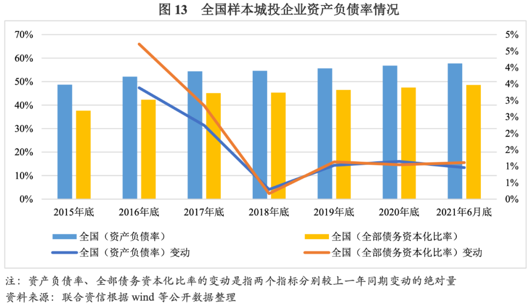 在資產(chǎn)負(fù)債率、全部債務(wù)資本化比率方面,樣本城投企業(yè)2015-2020年及2021年6月底的變化趨勢基本一致。2015-2017年,樣本城投企業(yè)資產(chǎn)負(fù)債率、全部債務(wù)資本化比率的增長幅度相對較大,杠杠水平上升較快;2018年底,樣本城投企業(yè)資產(chǎn)負(fù)債率、全部債務(wù)資本化比率的增幅較2017年底明顯下降,企業(yè)杠桿水平增長放緩。2019-2020年及2021年6月底,上述指標(biāo)增幅略有回升,幅度均在2.0%以內(nèi)。2021年6月底,樣本城投企業(yè)資產(chǎn)負(fù)債率、全部債務(wù)資本化比率分別為57.75%和48.61%。