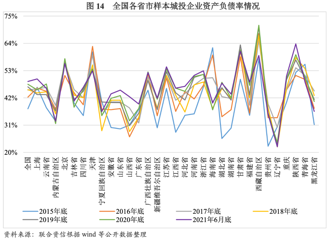 從區(qū)域分布來看,2015-2020年及2021年6月底,在降杠桿背景下各省市樣本城投企業(yè)資產(chǎn)負(fù)債率、全部債務(wù)資本化比率變化趨勢相近,大部分省市呈上升趨勢,但增速開始走緩。其中,地區(qū)生產(chǎn)總值在全國排名前列的區(qū)域,因融資渠道較寬,其城投債發(fā)行規(guī)模也較大,如江蘇、浙江、山東、湖南、四川等區(qū)域,資產(chǎn)負(fù)債率和全部債務(wù)資本化比率上升趨勢較平穩(wěn)。同期,經(jīng)濟(jì)實力較弱的地區(qū)如遼寧、內(nèi)蒙古、天津、海南,當(dāng)?shù)貥颖境峭镀髽I(yè)普遍存在較大的融資壓力,資產(chǎn)負(fù)債率及全部債務(wù)資本化比率均呈下降趨勢。