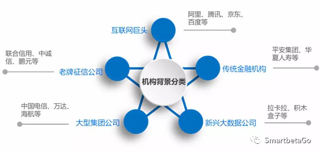 根據機構背景不同,目前主要有互聯網巨頭、老牌征信公司、傳統金融機構、大型集團公司和新型大數據公司五類機構參與開展征信業務。
