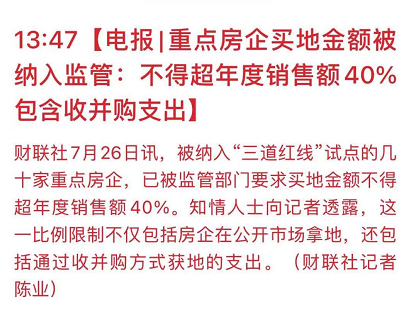 財聯社7月26日訊,被納入“三道紅線”試點的幾十家重點房企,已被監管部門要求買地金額不得超年度銷售額40%。