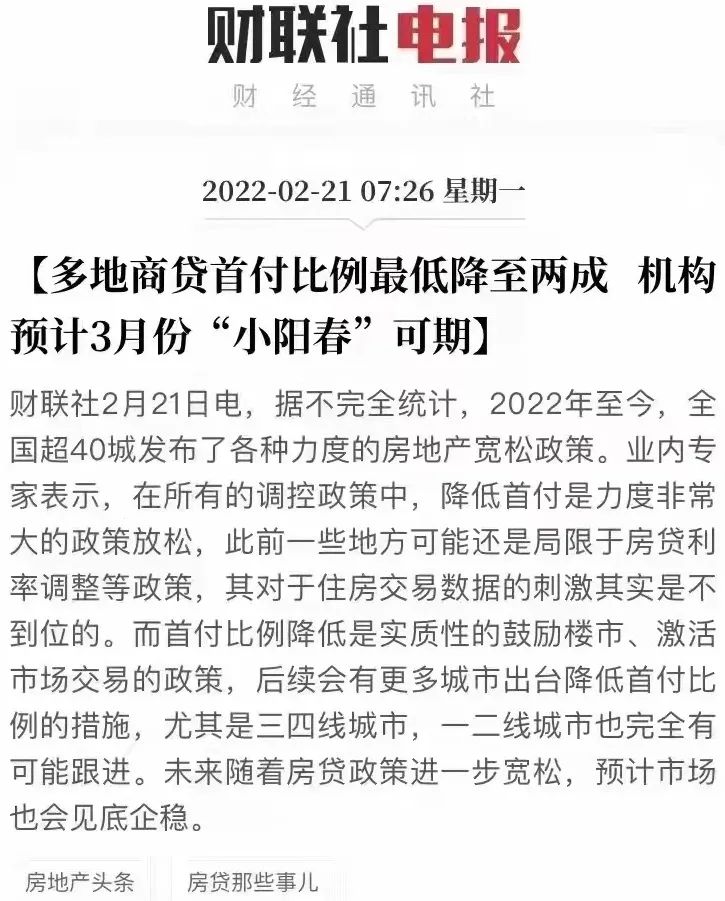 4、因城施策降低首付等還會很多,不值得驚訝。上周媒體報道,山東菏澤工行、建行、農(nóng)行自 2月14日起,名下無住房且無個人住房貸款記錄的購房者,首付比例可執(zhí)行20%。