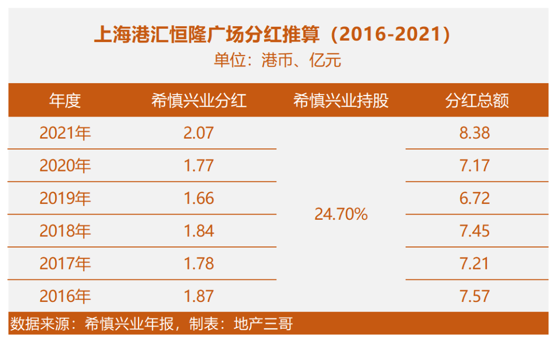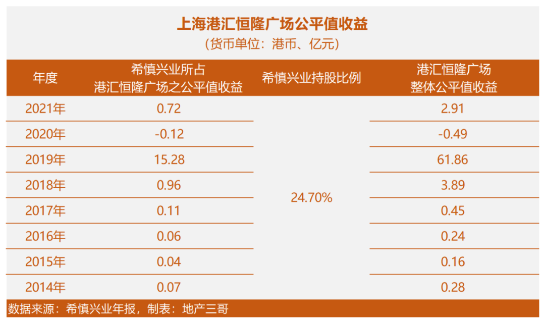 這個數(shù)字和希慎興業(yè)2021年年報中反映的基本一致:在希慎興業(yè)年報中,聯(lián)營公司港興公司營業(yè)額18.67億元港幣,折合人民幣15.8億元左右,上海港匯廣場是港興公司旗下唯一項目。