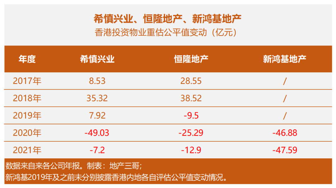 2020年、2021年希慎興業(yè)、恒隆地產(chǎn)、新鴻基地產(chǎn)都錄得了不同程度的公平值虧損: