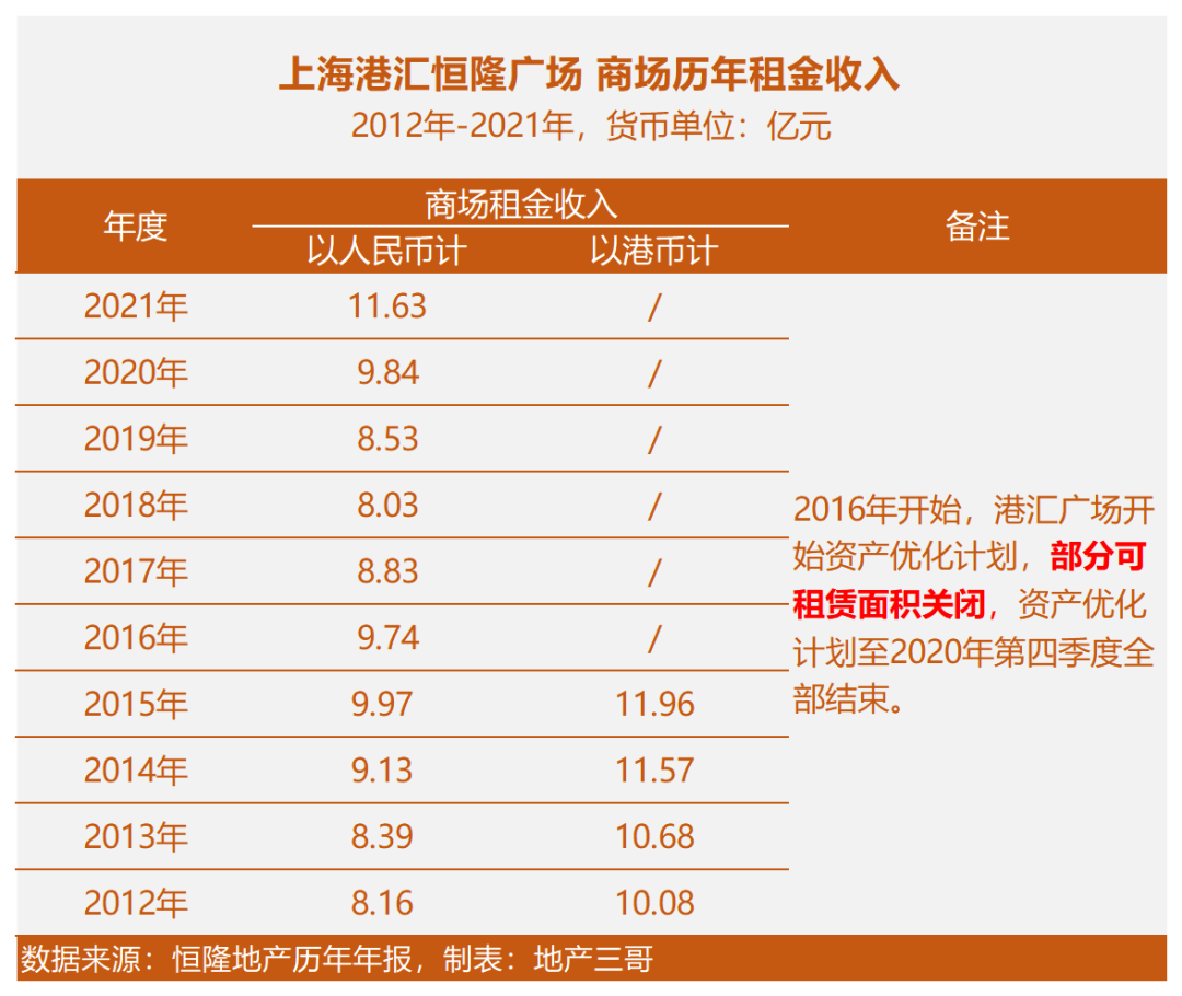 單純看商場版塊:港匯恒隆廣場歷年來租金穩(wěn)步上升,2017-2020年,因為改造,關閉部分可租賃面積,因此整體租金下降。