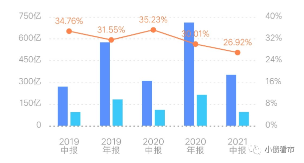 近年來,受結轉項目區域分布影響,龍光集團整體營業毛利率呈下行趨勢,2021年中期降至26.92%。